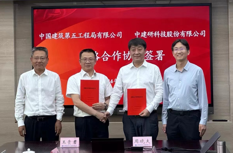 5月22日下午,中建研科技股份有限公司(以下簡(jiǎn)稱“中建研科技”)與中國建筑第五工程局有限公司(以下簡(jiǎn)稱“中建五局”)在長沙簽署戰(zhàn)略合作協(xié)議。中建研科技黨委書記、董事長劉軍進(jìn),中建五局副總經(jīng)理、總工程師李凱出席簽約儀式。中建研科技副總裁周曉夫,中建五局副總工程師、建筑設(shè)計(jì)院黨委書記王貴君代表雙方簽署戰(zhàn)略合作協(xié)議。