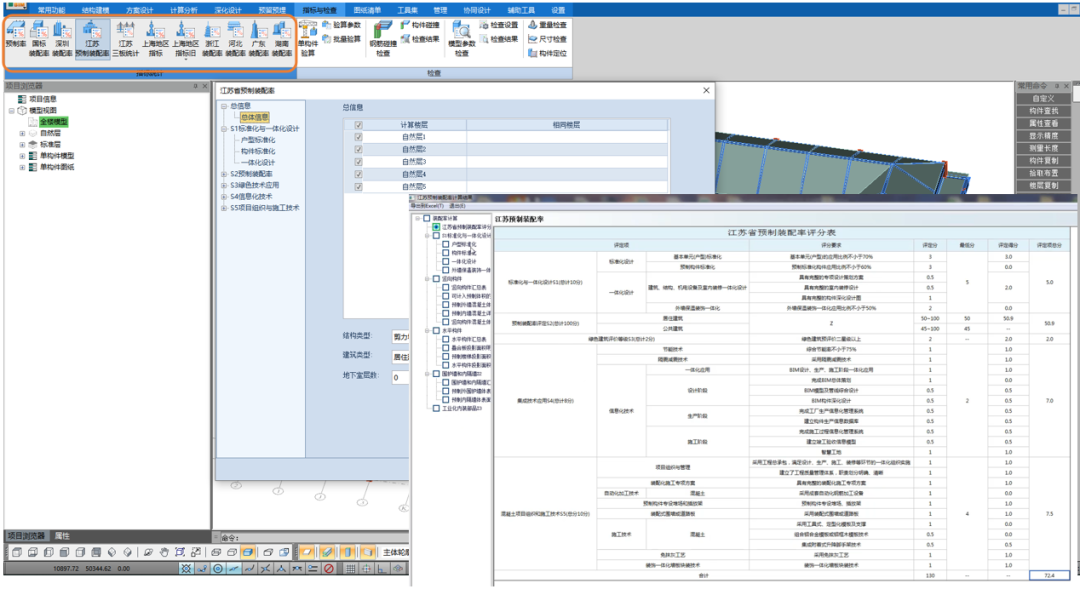 內置多種構件類型(含預制板、預制梁、預制柱、預制剪力墻、飄窗、樓梯、陽臺板、空調板、外掛板等15種構件類型),可快速生成裝配式方案,基于模型可直接統計預制率、國標及多地裝配率。