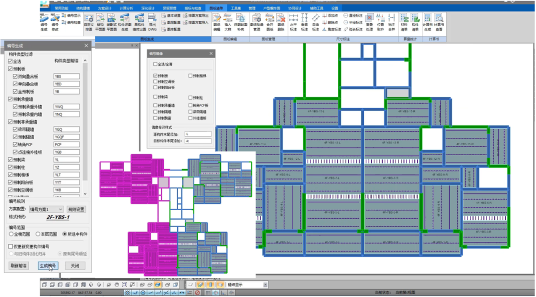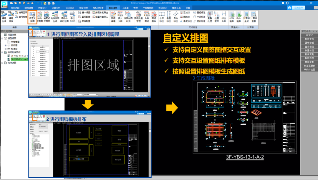 出圖階段提供構件編號歸并、自定義排圖以及各類圖紙批量生成和管理功能,自動生成高質量詳圖圖紙