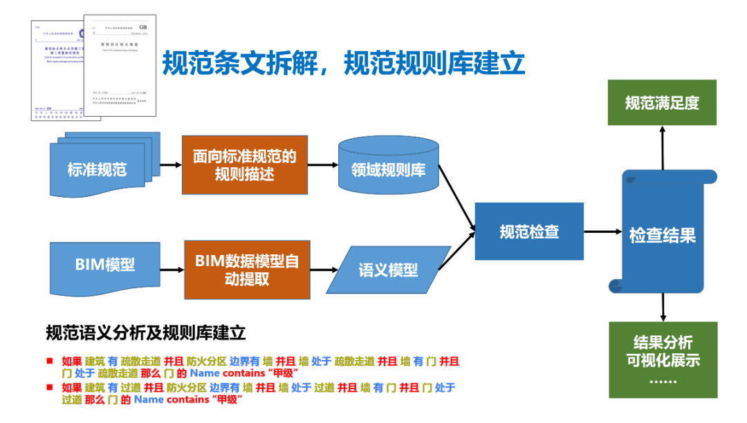 系統對規范條文進行拆解形成領域規則庫,對BIM模型自動提取數據形成語義模型,通過審查引擎對領域規則庫及語義模型進行審查,最終得到審查結果。