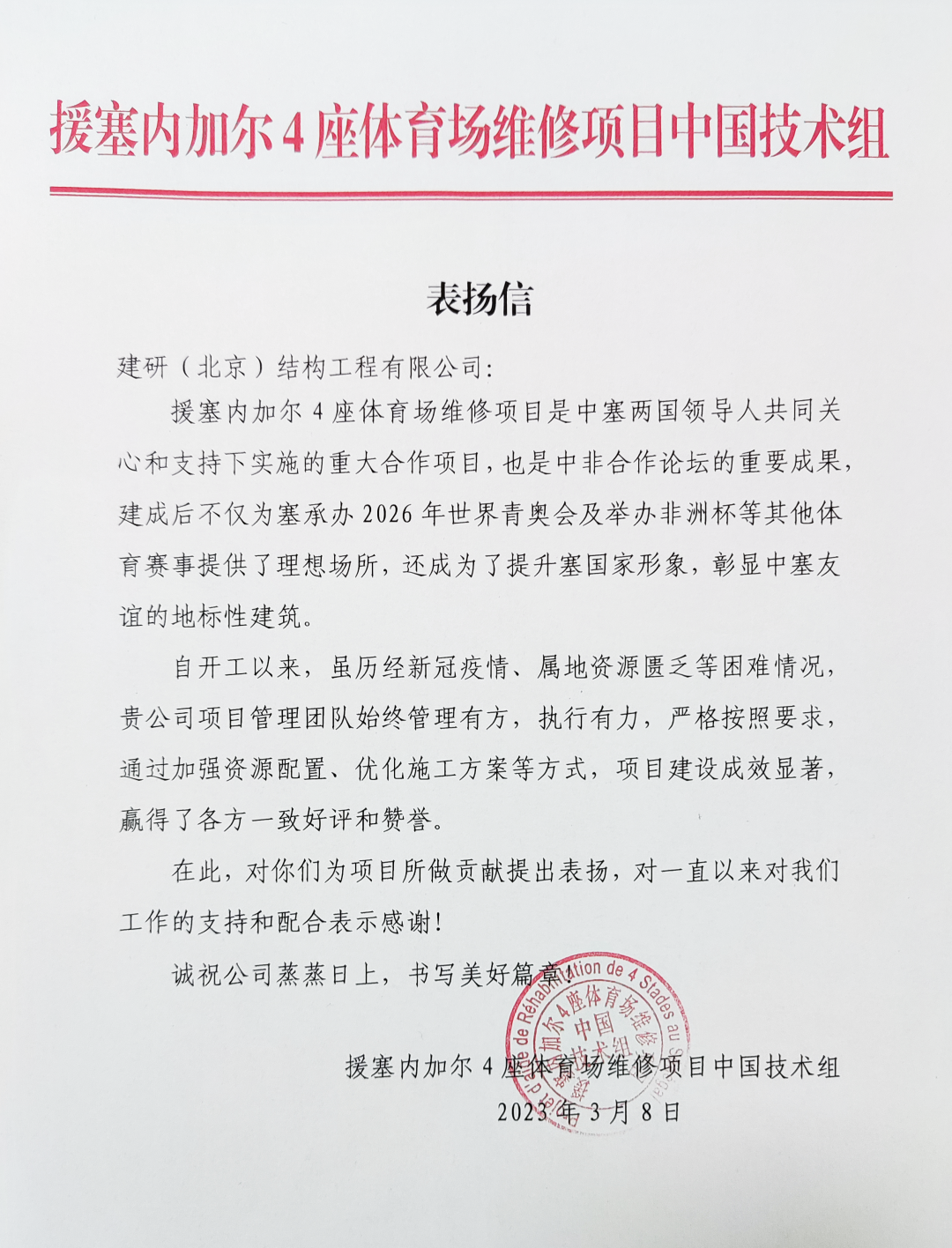 近日,援塞內(nèi)加爾4座體育場維修項(xiàng)目中國技術(shù)組向中建研科技所屬建研(北京)結(jié)構(gòu)工程有限公司(以下簡稱結(jié)構(gòu)公司)發(fā)來表揚(yáng)信,充分肯定和表揚(yáng)了結(jié)構(gòu)公司項(xiàng)目管理團(tuán)隊(duì)在該項(xiàng)目中作出的重要貢獻(xiàn)。