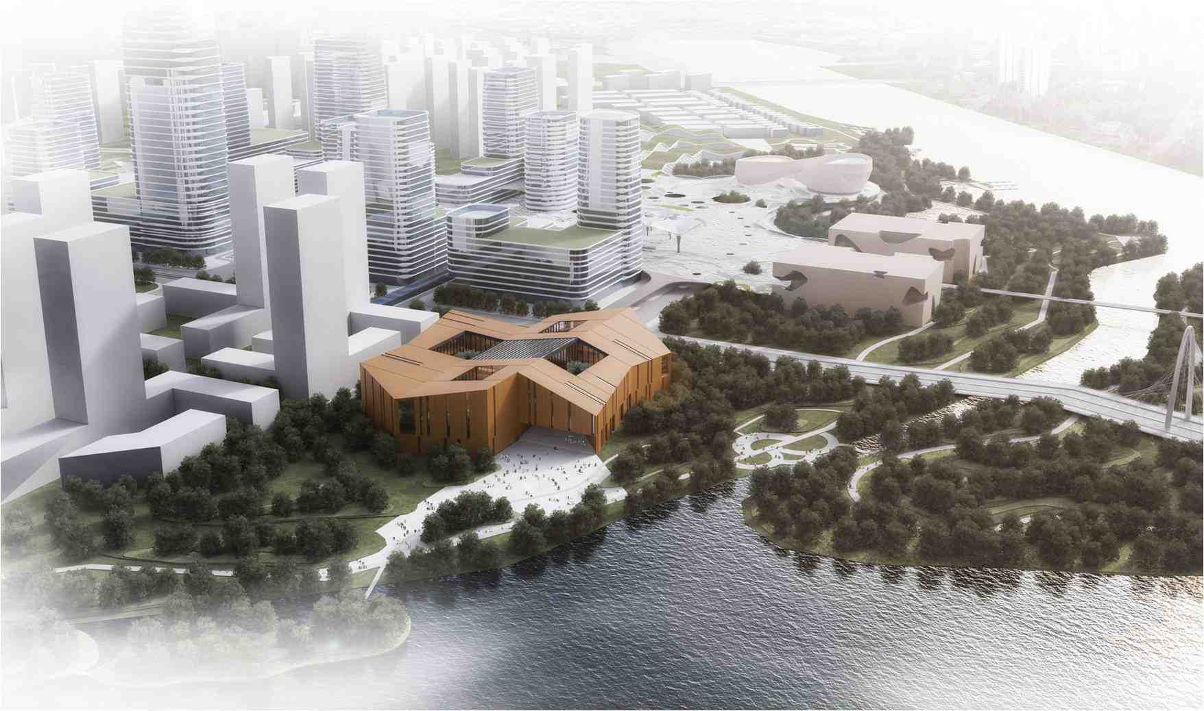 在布局上,兩館統一在一個建筑形體中,居中布置了共享大廳,圖書館和檔案館的功能,分別設置在建筑的西北側和東南側。在共享大廳的南北兩側設置了室外庭院,共享大廳、室外庭院、大臺階共同將西側城市道路與沿河景觀相連接,為市民提供一休閑、交流的文化場所。 緊湊的建筑布局及外觀,不僅體現了功能的要求,也反映了邏輯鮮明、不證自明的空間秩序。地塊呈不規則形態。建筑外形采用折面的建筑語言,這是建筑對不規則場地的主動適應,使得建筑能夠更好地與環境融為一體,生長于這一特定場所的建筑成為了獨一無二的作品。與自由不規則的外輪廓相比,建筑的內部空間通過十分規則的網格系統進行分割組織,使得各個功能區得以明確的界定,并實現高效的內部交通組織與經濟合理的結構選型。折面的屋頂是折形立面的延續,在使用了相同的立面材料后,整個建筑外觀渾然一體。外墻材料采用彩GRC掛板,而且選用明快的橘紅色,結合折線變化的建筑造型,簡潔并富有現代感,成為天津中新生態城核心區重要的標志性建筑。