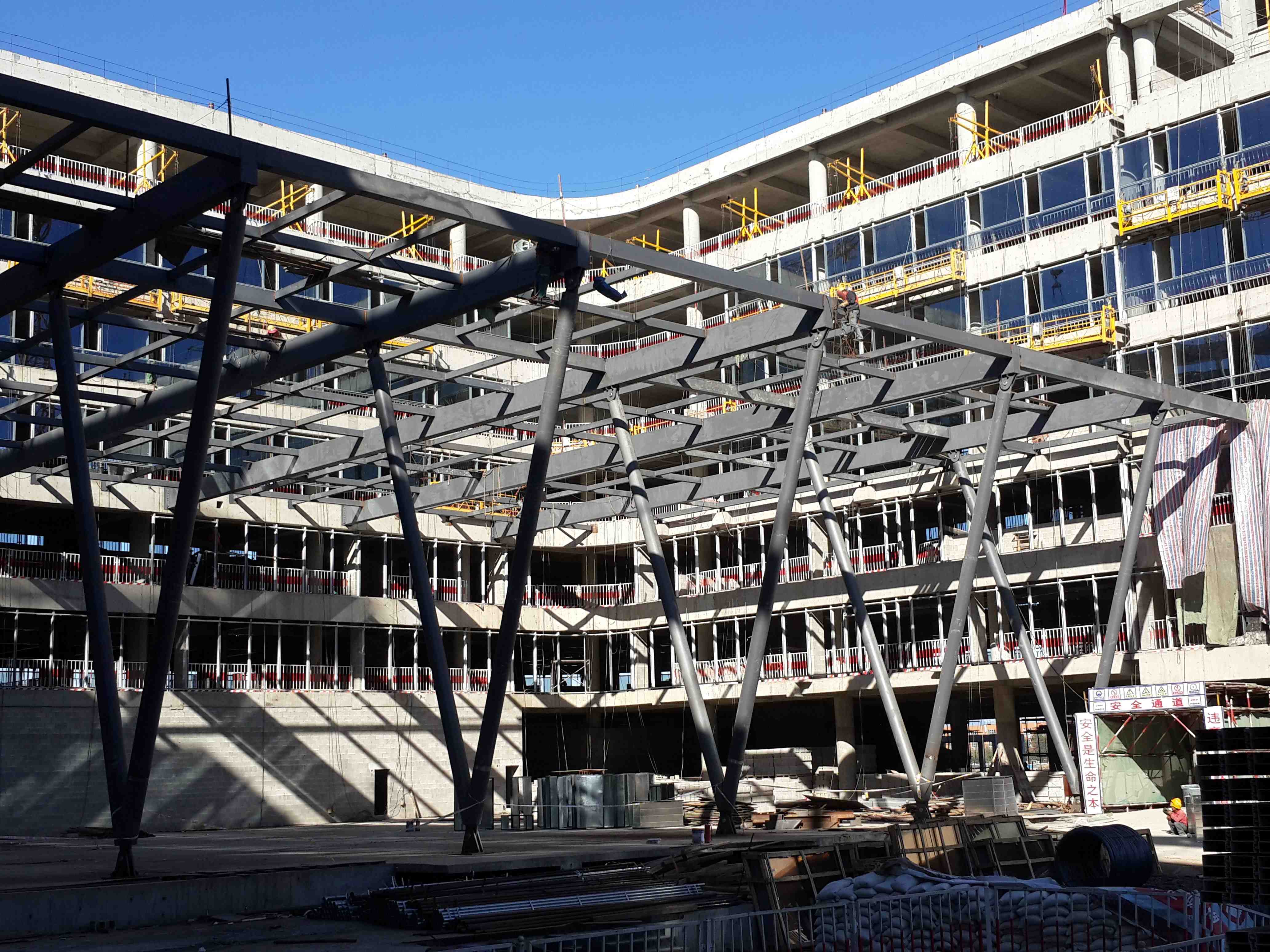 鋼結(jié)構(gòu)施工。空間管桁架相貫連接,結(jié)構(gòu)造型復(fù)雜。