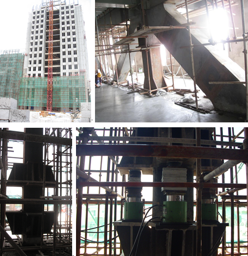 某在建大樓轉換桁架跨度18m,高4m,上部支撐十四層樓面荷載。由于施工時桁架焊接不理想,存在著安全隱患,必須對轉換桁架進行加固處理。因鋼桁架已經承擔較大的豎向荷載,不宜直接進行焊接操作,須先進行卸載。最終采用先增設臨時支撐,將上層框架柱的荷載傳給下部結構然后再焊接。實施時采用8臺千斤500t千斤頂同步頂升,進行卸載,卸載完成后再進行加固。